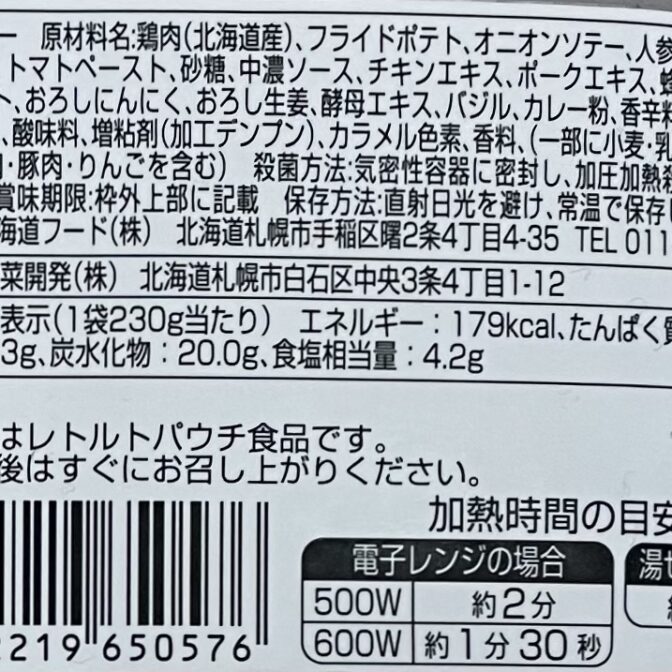 原材料/添加物 鶏肉(北海道産)、フライドポテト、オニオンソテー、人参、カレールウ、しょうゆ、トマトペースト、砂糖、中濃ソース、チキンエキス、ポークエキス、蜂蜜、乾燥マッシュポテト、おろしにんにく、おろし生姜、酵母エキス、バジル、カレー粉、香辛料/調味料(アミノ酸等)、酸味料、増粘剤(加工デンプン)、カラメル色素、香料